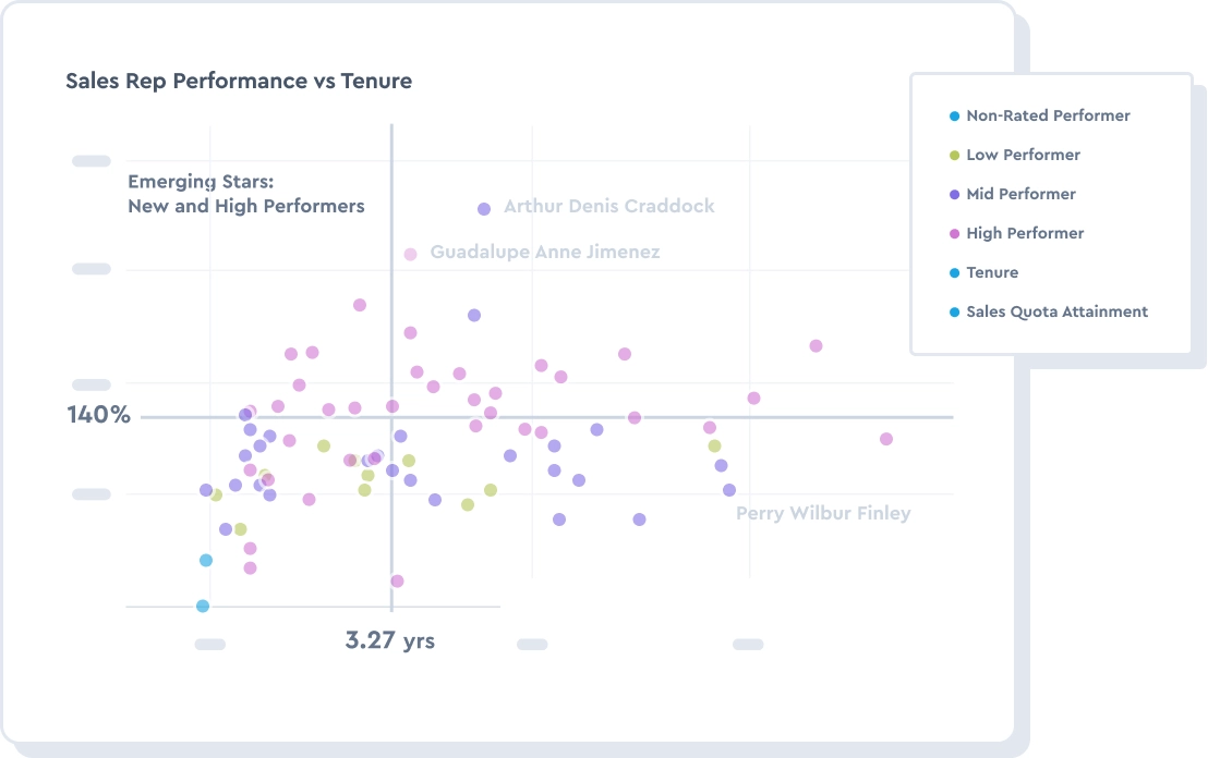 في ظروف السوق الصعبة، يعد الفهم الدقيق للقوى العاملة لديك أمرًا بالغ الأهمية. يكشف Visier عن نقاط الموهبة المضيئة التي تحتاج إلى الحفاظ عليها: أصحاب الأداء المتميز، والفرق الفعالة، والقادة المخفيون، والمزيد. يمكنك أيضًا تحديد المجالات التي يجب تعديلها بسرعة، مثل أحجام الفريق وبنيته، ونطاقات التحكم، وأنواع التوظيف.